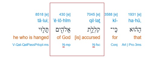 I somehow missed this when I originally published the article. For some reason, I didn’t notice that the word “curse” in Deuteronomy 21:23 is a noun, not a verb. That’s the difference between: “The witch cursed the tomb“, and “There is a curse on the tomb“. One is doing an action, the other describes a person, place, or thing.